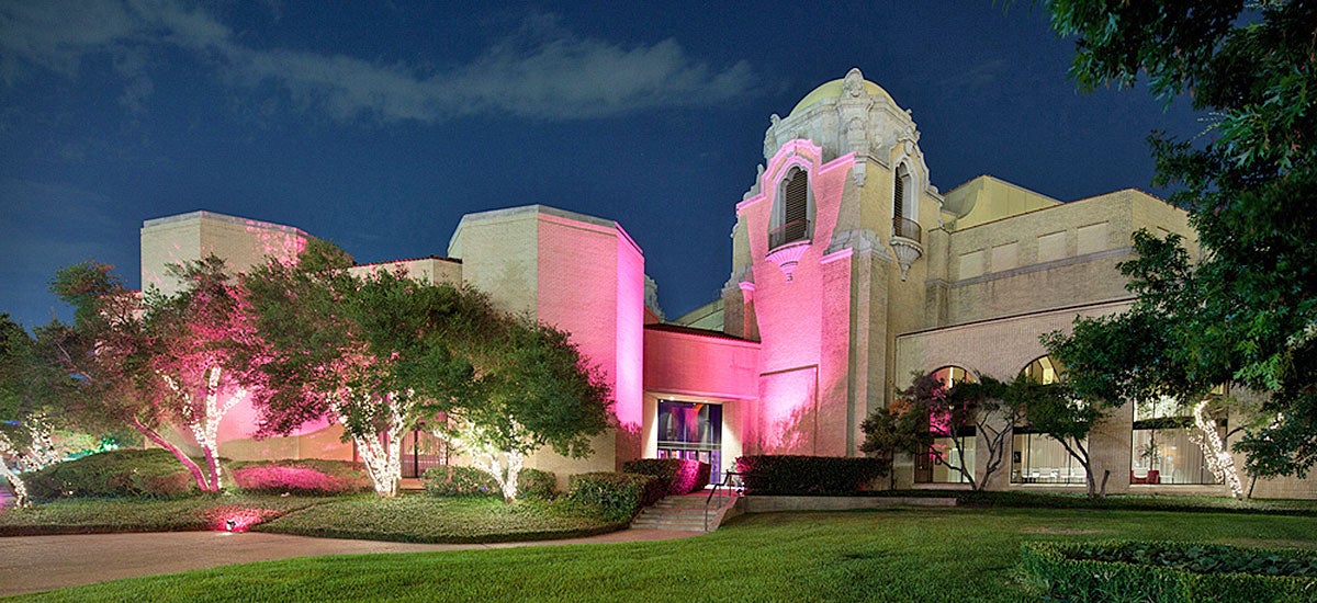 The building features Spanish Baroque architecture with Moorish influences, including six stair towers topped with cast domes and arcade porches overlooking Fair Park.